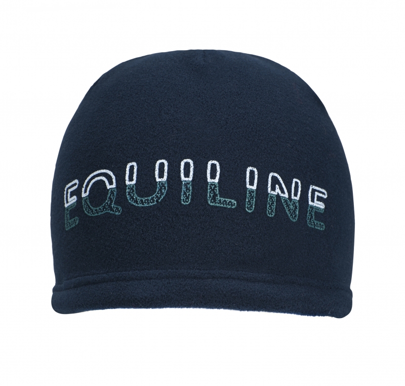 Fleecová čepice Equiline Cana tmavě modrá s gumovým 3D nápisem.