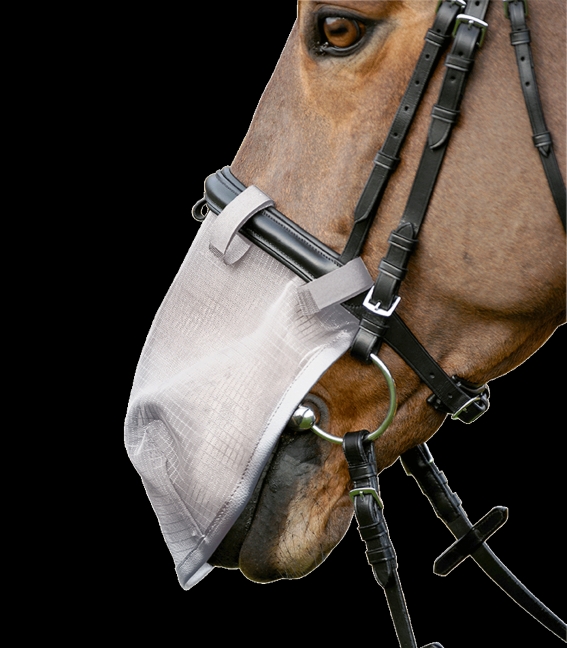 Síťka na nos pro koně, který je alergický na prach, pil, nebo létající hmyz. Omezuje házení hlavou pod sedlem. Lze připevnit na uzdečku i na ohlávku.