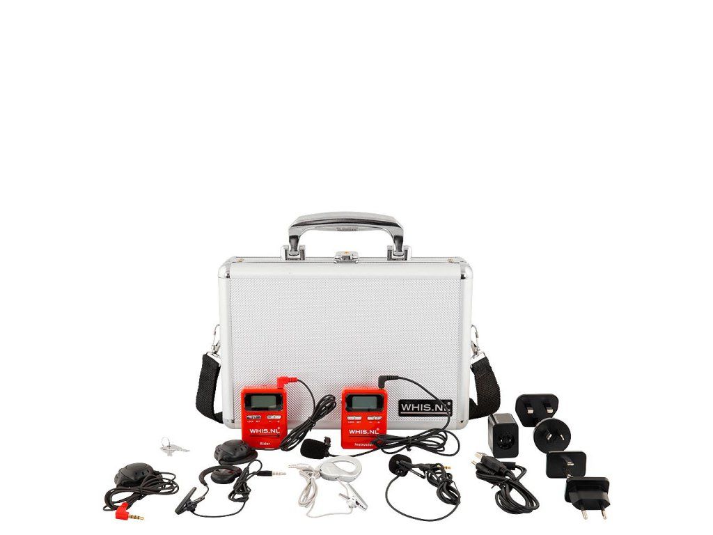 - Sada obsahuje: vysílač pro trenéra, přijímač pro jezdce, náhradní mikrofon a sluchátko, síťový adaptér pro nabíjení, popruh ke kufříku, podrobný návod k použití.